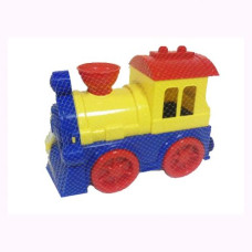 Яркий пластиковый паравозик. Можно открывать крышу. Есть петелька для верёвочки, либо для прицепа ва..